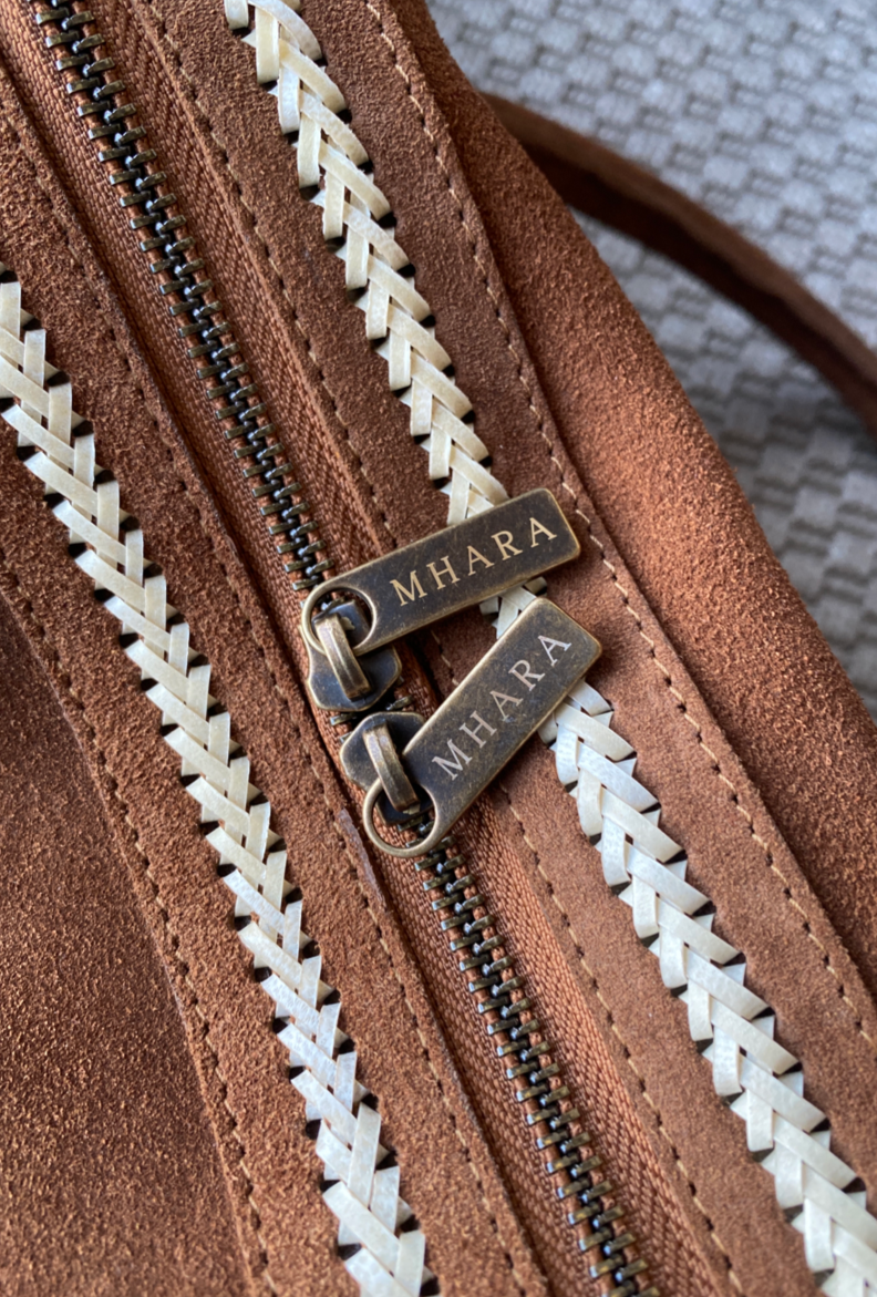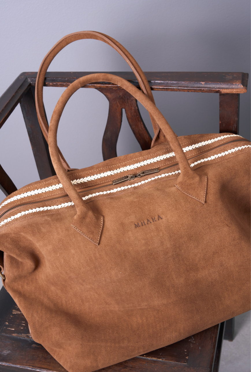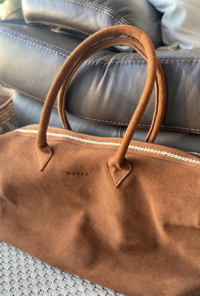 Cartera, maleta pequeña, bolsa de gamuza forrada en su interior con lona natural. Una tonalidad oscura en la gama del color café, una pieza fácil para vestir y combinar.